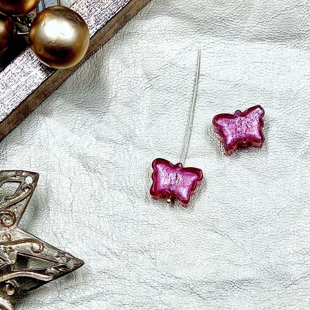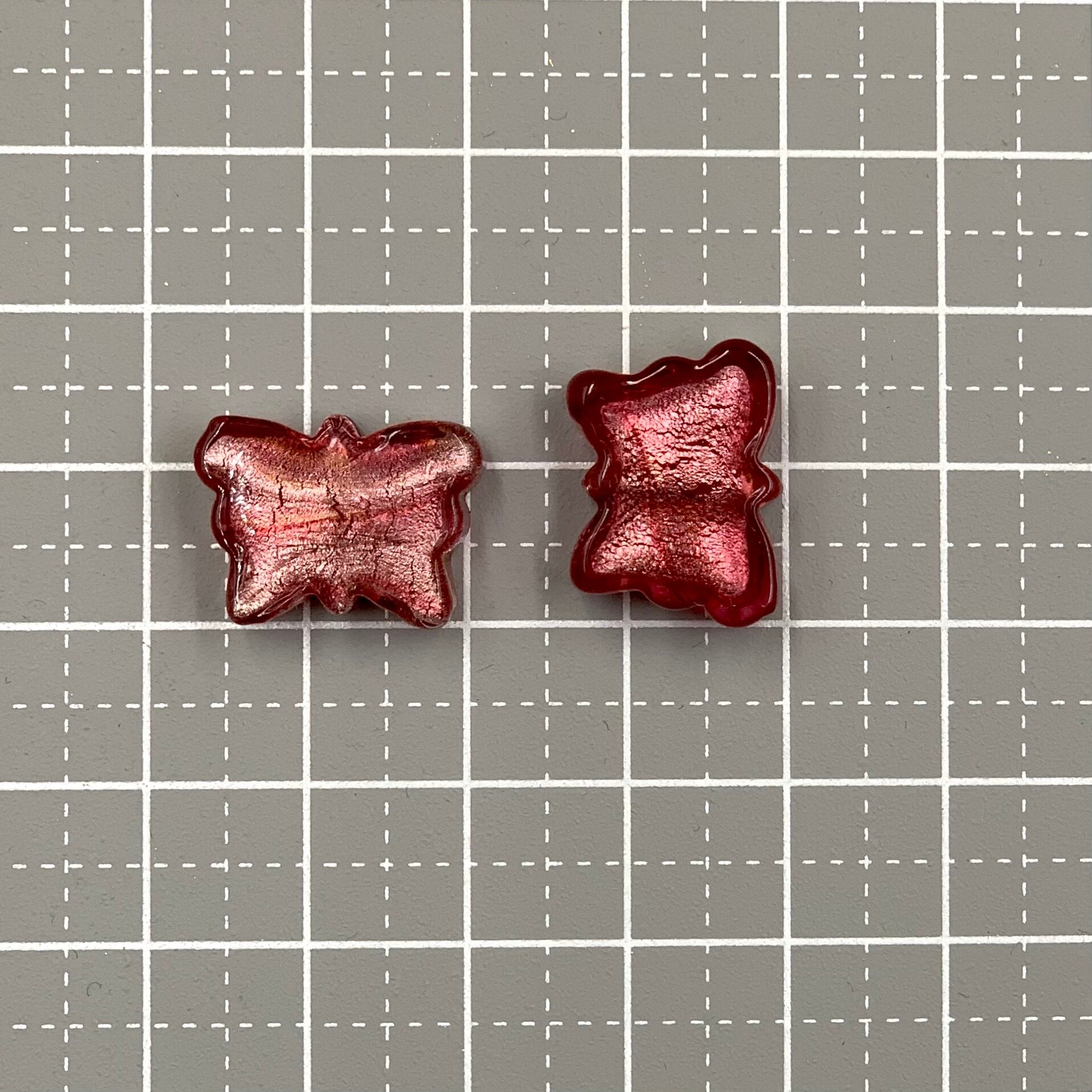 可愛らしい蝶々の形をしたビーズです。ホワイトゴールドの箔入りで、高級感があります。サイズは縦約10mm(3枚目の画像は、1cm方眼マットに乗せたものです)。 2個セット、イタリア製。