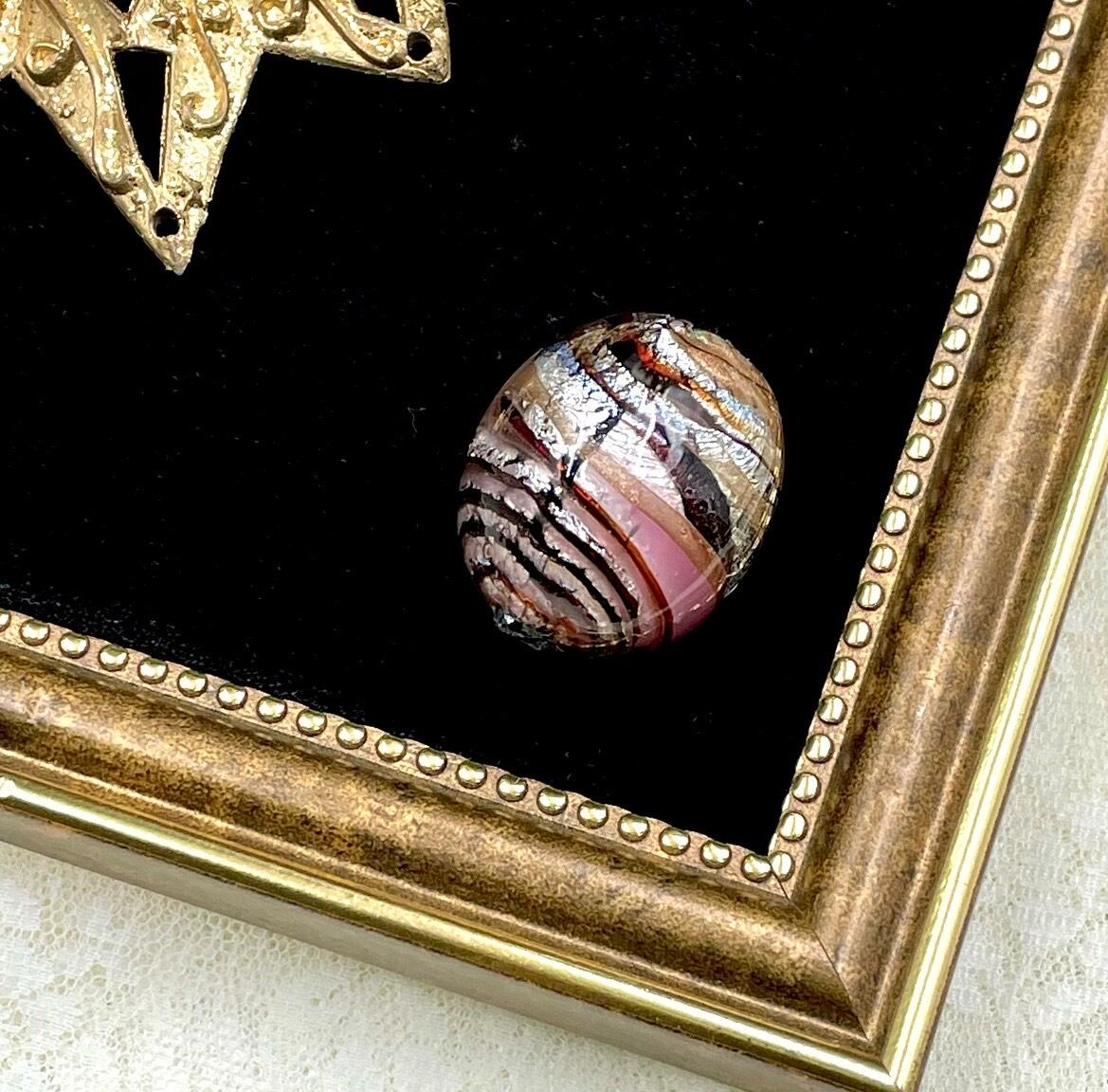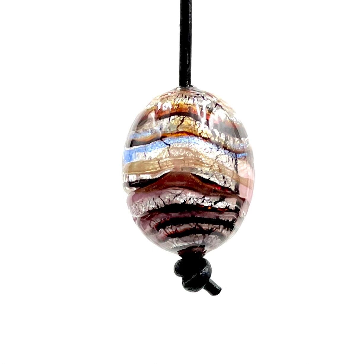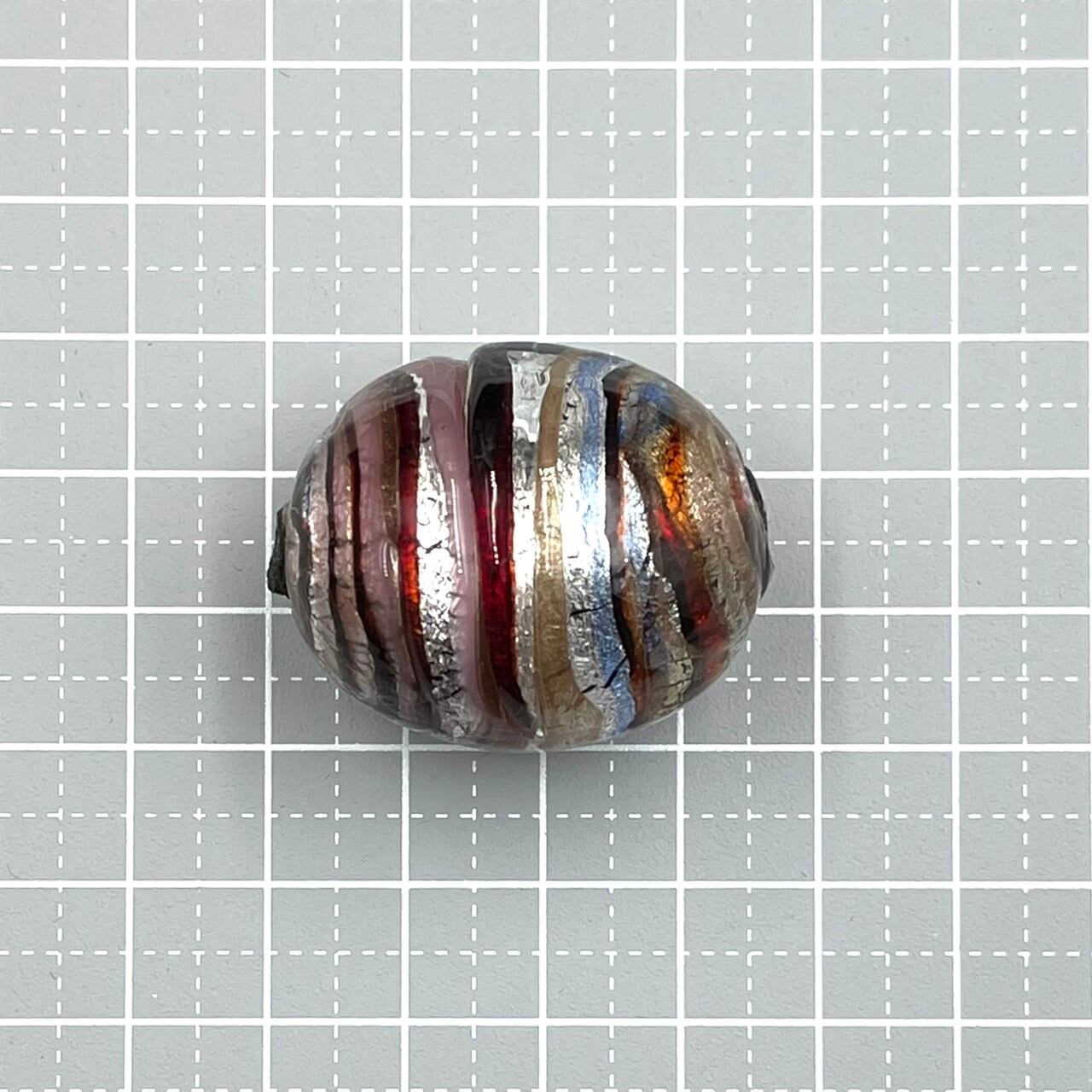 様々な表情を見せてくれるヴェネチアンの大玉です。即興的に作られたものなので、同じ色味を再び作ることはできません。縦約35mm、重さ33g(ずっしり重いパーツです)。2.5mmの革紐が通ります。イタリア製。