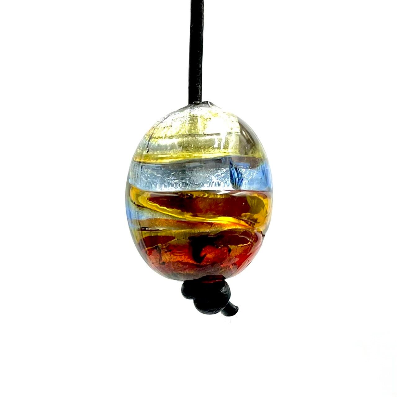 様々な表情を見せてくれるヴェネチアンの大玉です。即興的に作られたものなので、同じ色味を再び作ることはできません。縦約35mm、重さ32g(ずっしり重いパーツです)。2.5mmの革紐が通ります。イタリア製。
