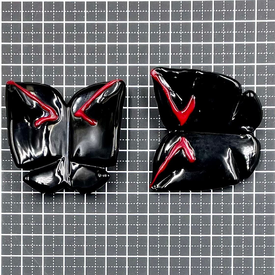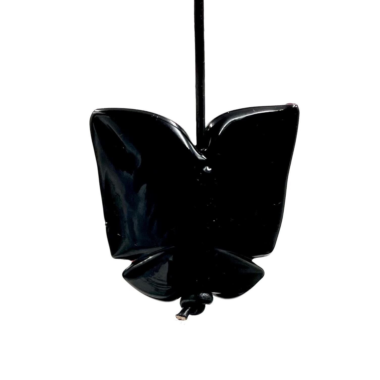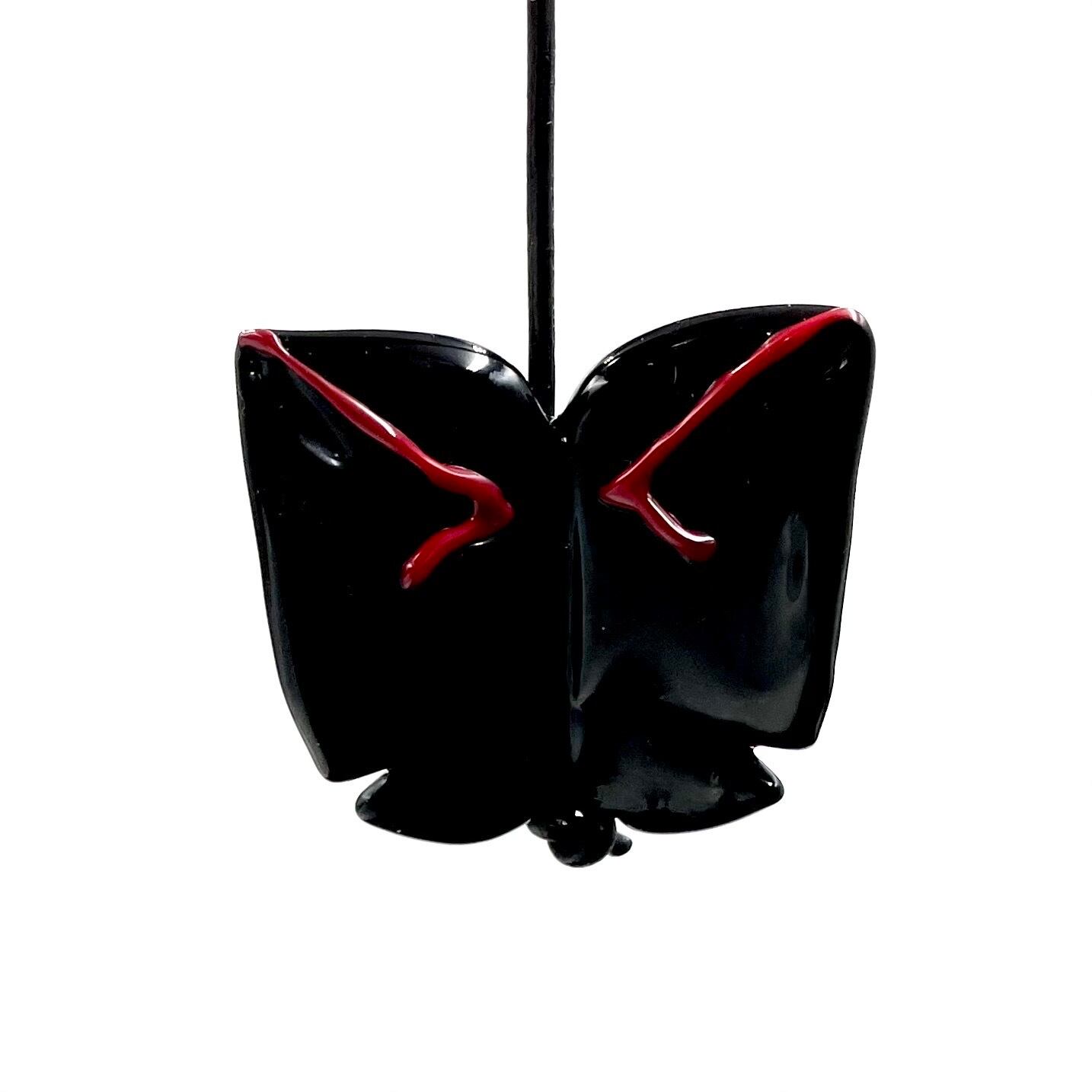漆黒の蝶の形のパーツです。赤のラインがポイントになっています(表面のみ。裏は黒1色です。)中心部約45mmと、ビッグサイズです。2.5mmの革紐が通ります。イタリア製。