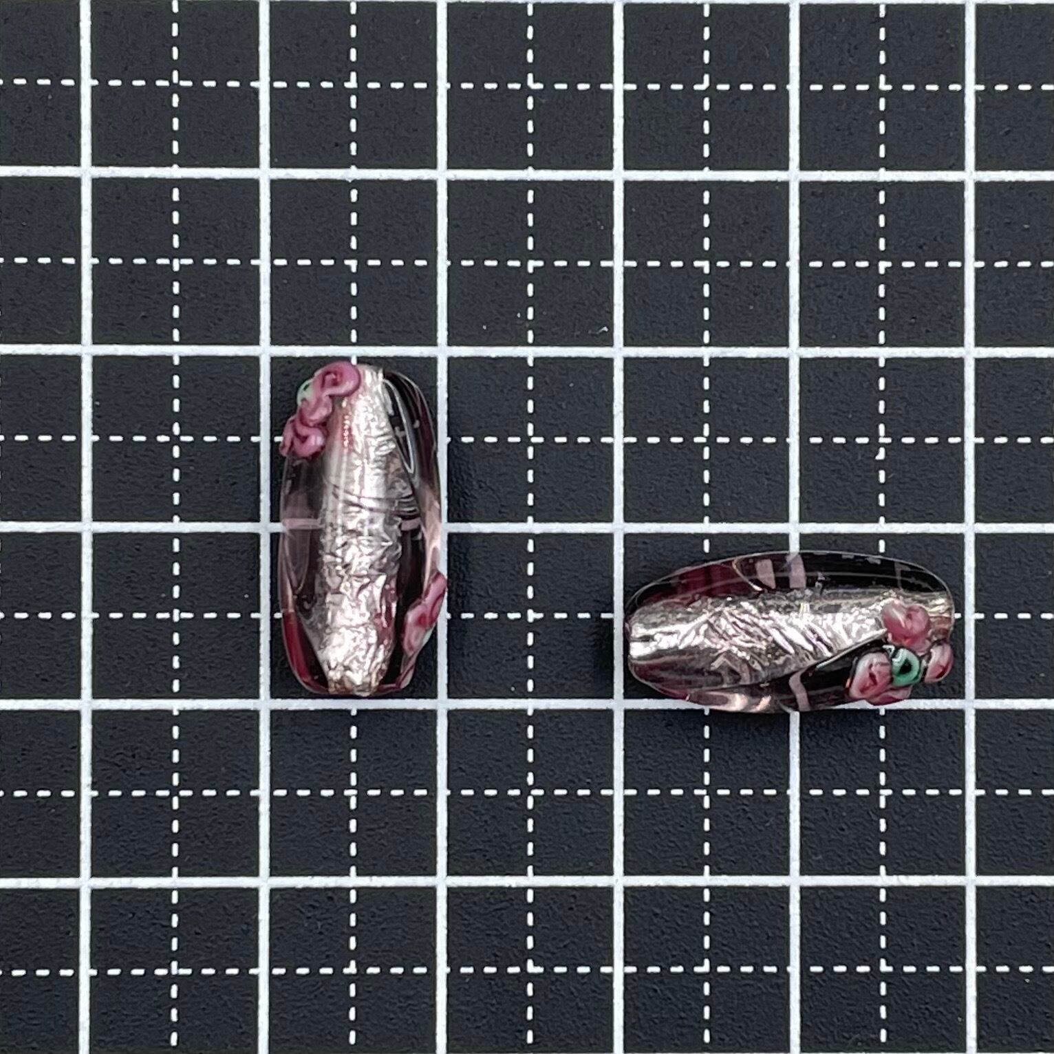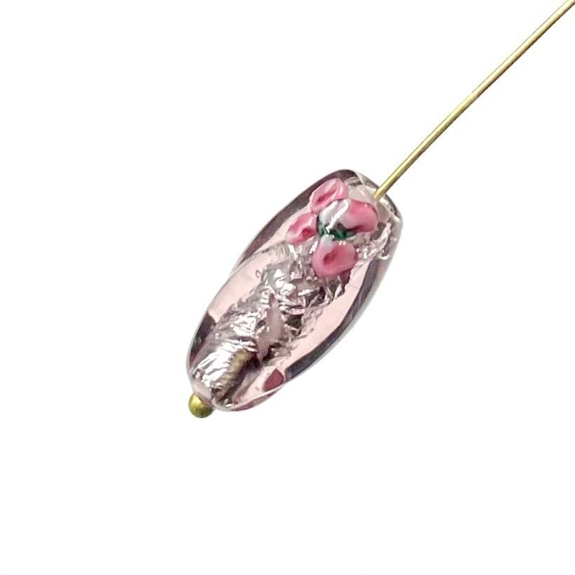 チェコ製のランプワークビーズ、8×18mmのナツメ型。芯にシルバーフォイルを巻きつけた、典型的ボヘミアンビーズです。両サイドに施したピンクのお花がとても可愛いです。5個セット。
