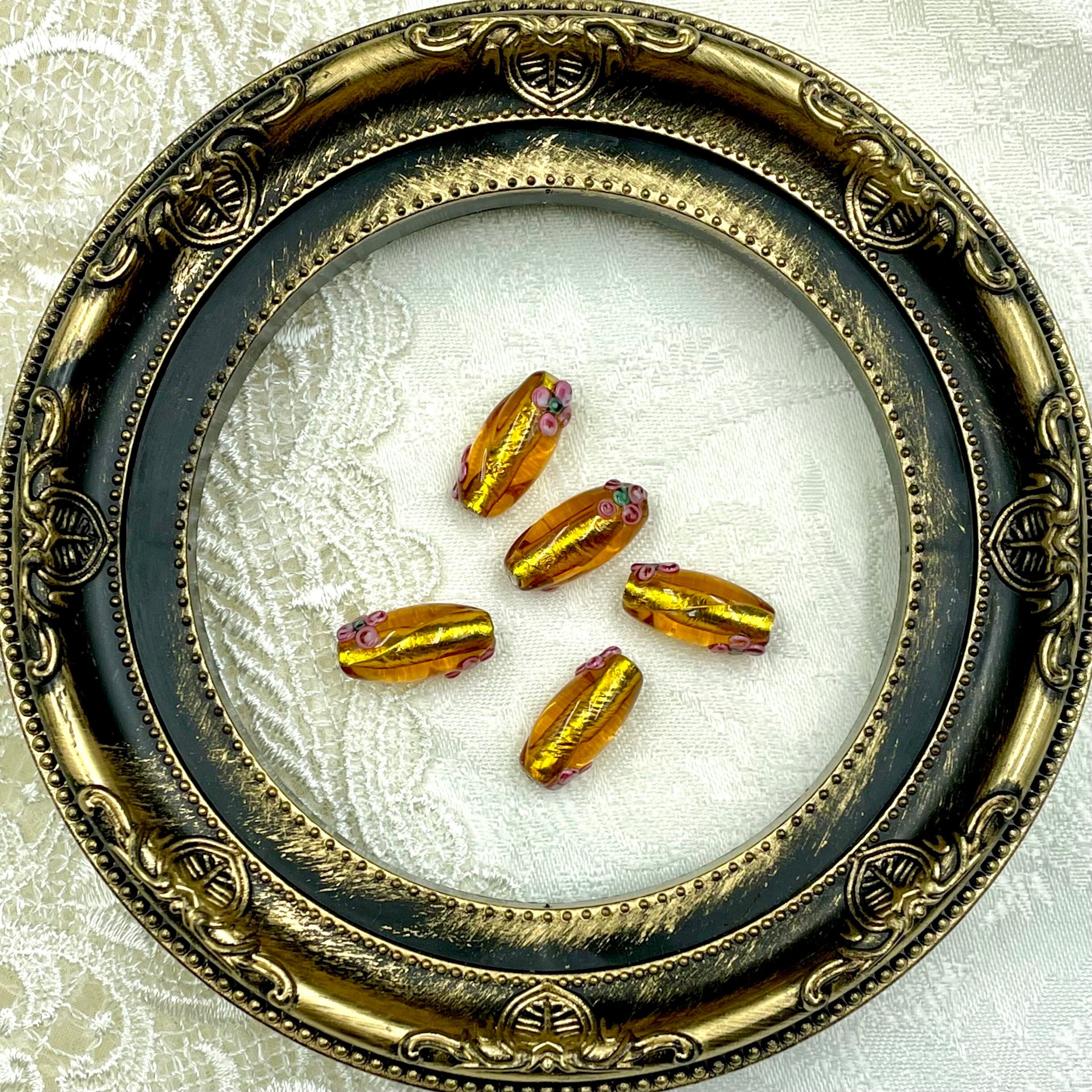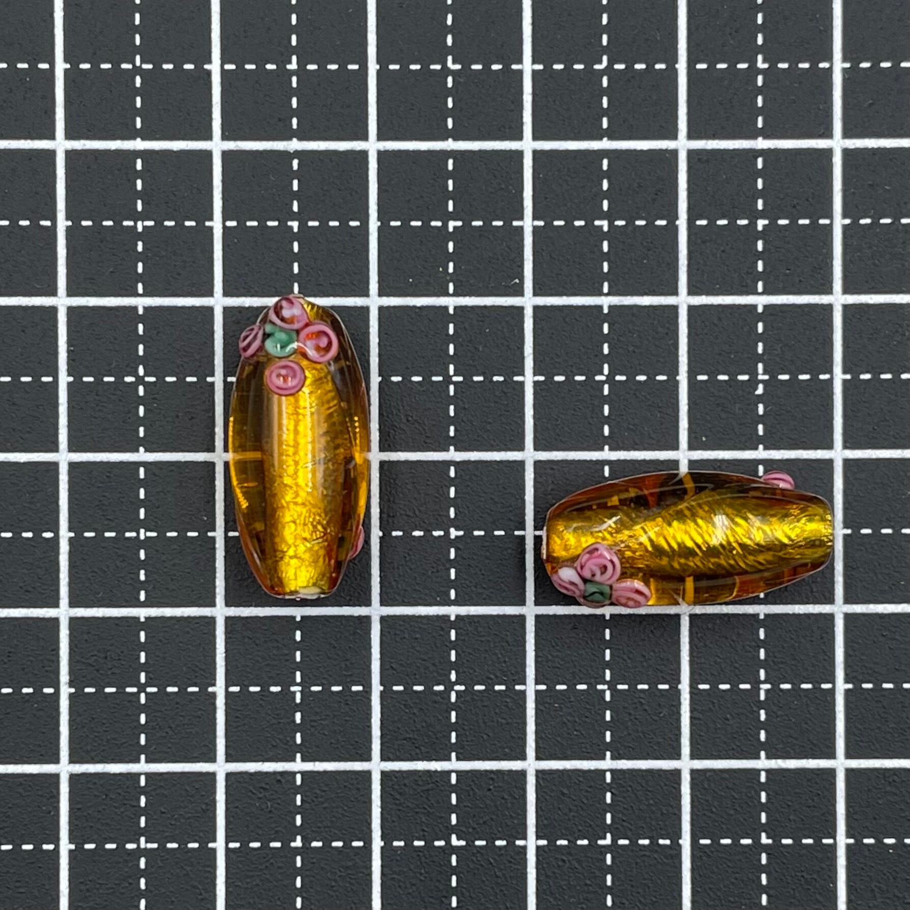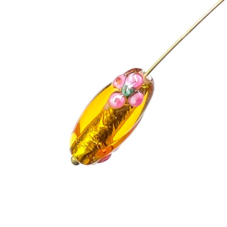 チェコ製のランプワークビーズ、8×18mmのナツメ型。芯にシルバーフォイルを巻きつけた、典型的ボヘミアンビーズです。両サイドに施したピンクのお花がとても可愛いです。5個セット。