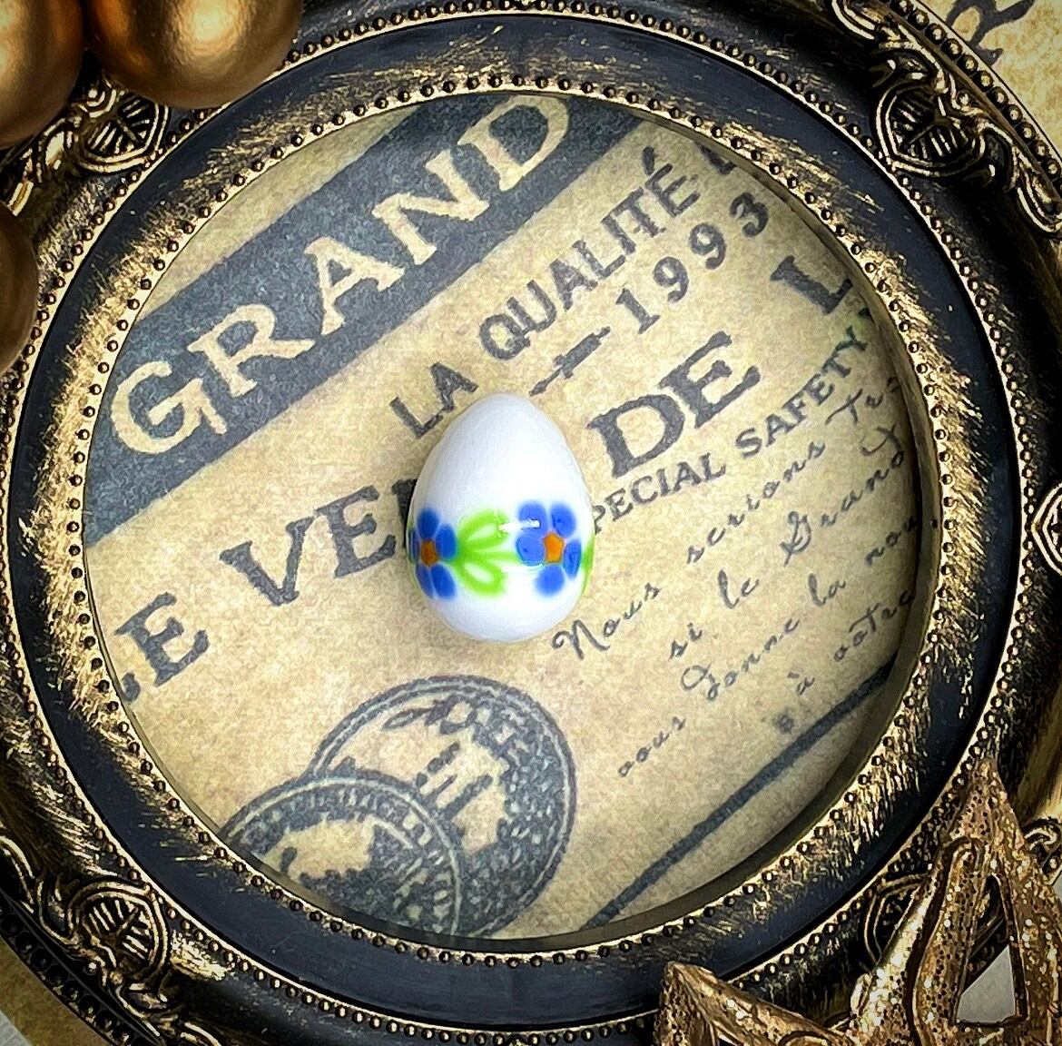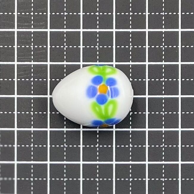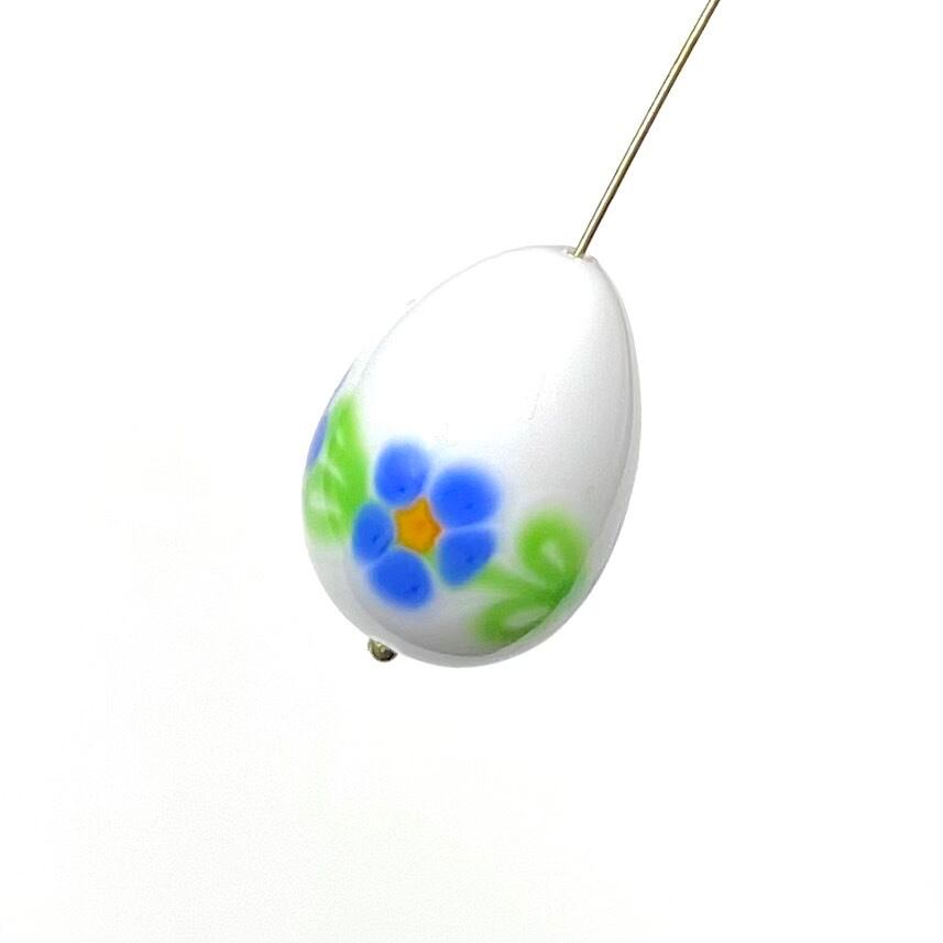 チェコ製のランプワークビーズ、珍しい卵型。いかにも東欧っぽい花模様が可愛らしいです。サイズは縦約24mm、ペンダントトップにしても素敵です。穴サイズ約1.2mm。1個単位の販売です。