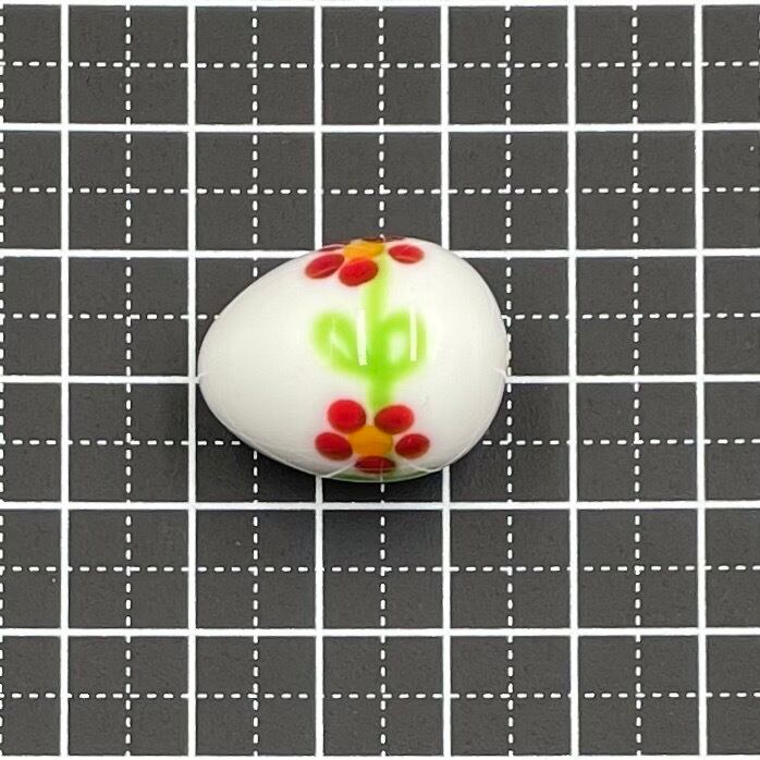 チェコ製のランプワークビーズ、珍しい卵型。いかにも東欧っぽい花模様が可愛らしいです。サイズは縦約24mm、ペンダントトップにしても素敵です。穴サイズ約1.2mm。1個単位の販売です。