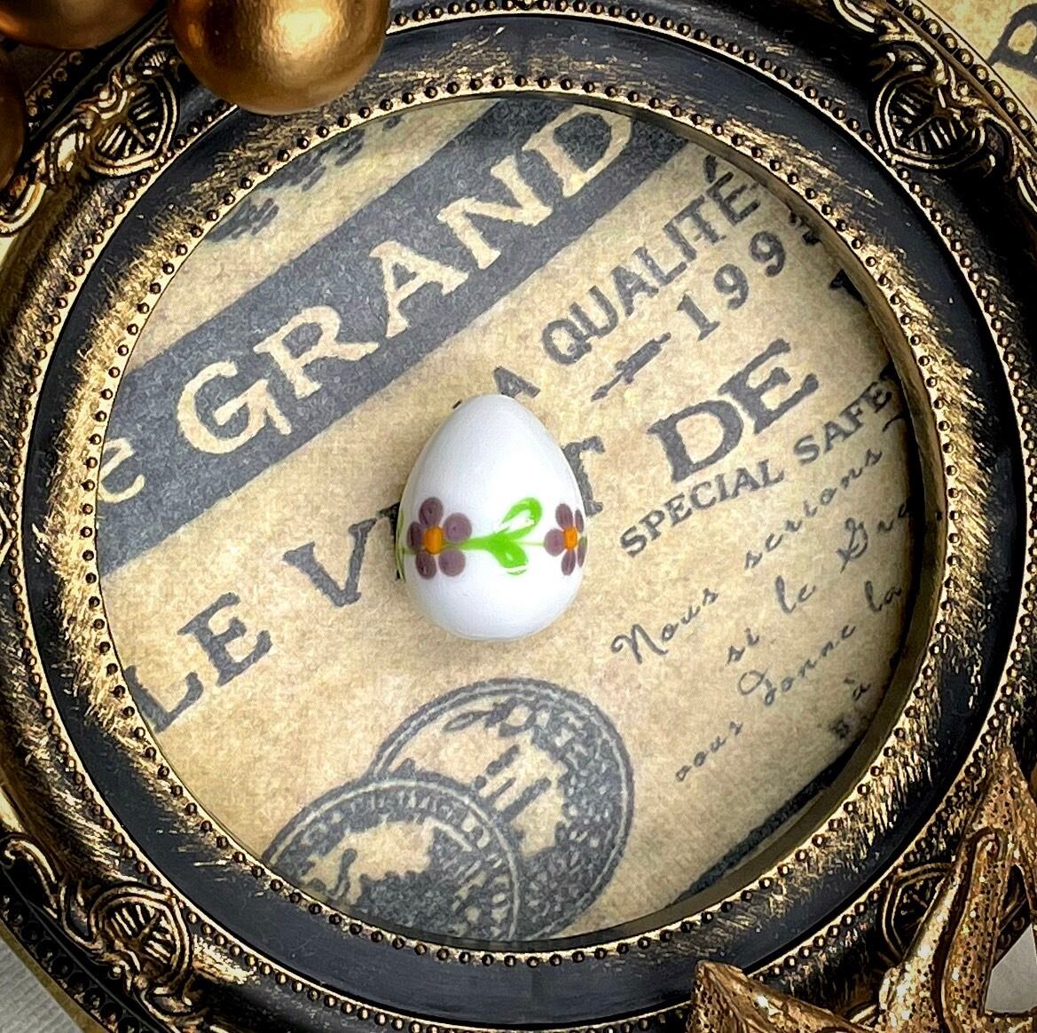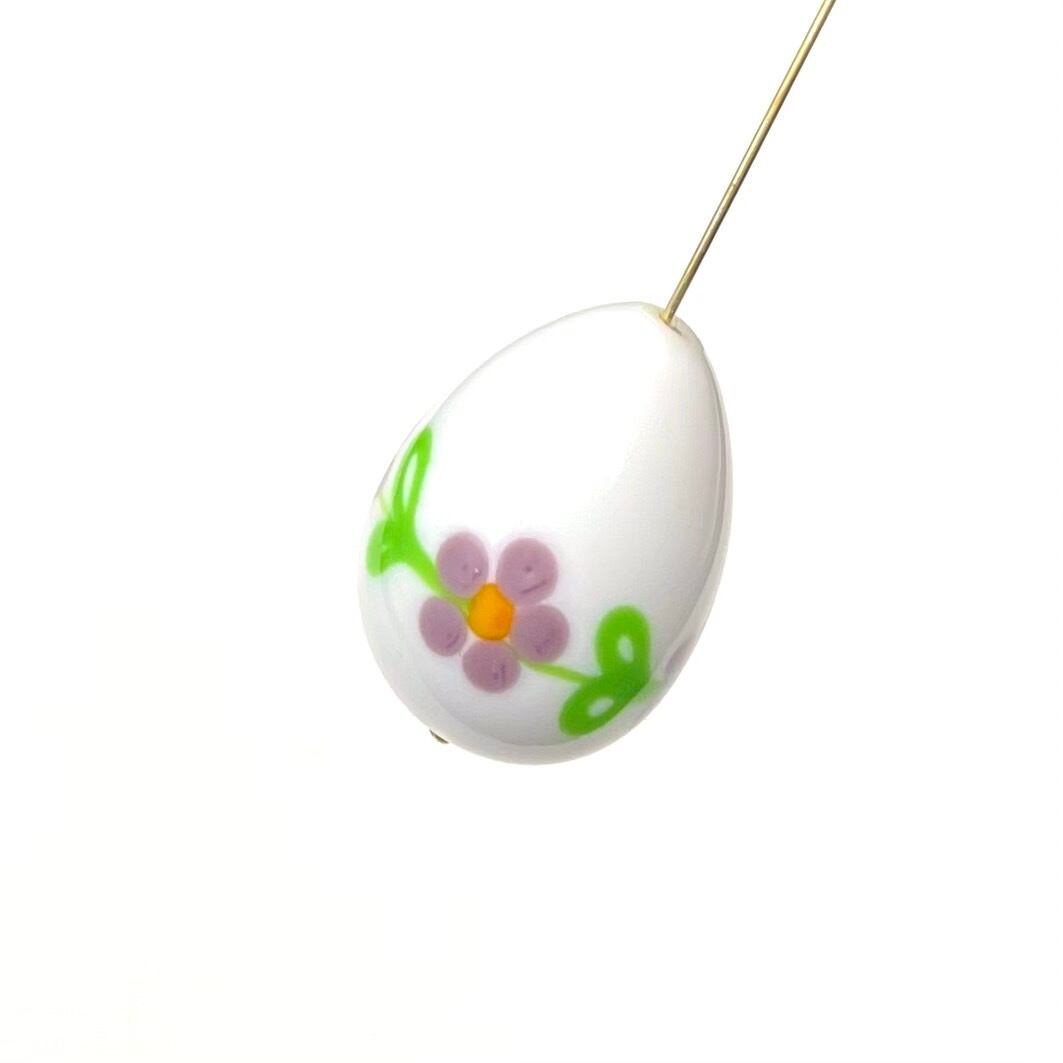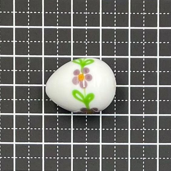 チェコ製のランプワークビーズ、珍しい卵型。いかにも東欧っぽい花模様が可愛らしいです。サイズは縦約24mm、ペンダントトップにしても素敵です。穴サイズ約1.2mm。1個単位の販売です。